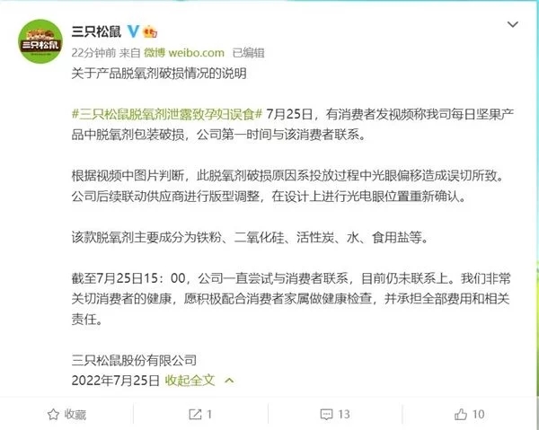 7月25日消息,一位顧客發視頻稱懷孕的老婆吃了半包三只松鼠堅果后,發現食品袋中的脫氧劑泄露。對此,三只松鼠稱此脫氧劑破損原因系投進過程中光眼偏移形成誤切所造成的。