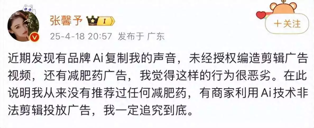 “近期發現有品牌用AI復制我的聲音,未經授權編造剪輯廣告視頻,還有減肥藥廣告,我覺得這樣的行為很惡劣。在此說明我從來沒有推薦過任何減肥藥,