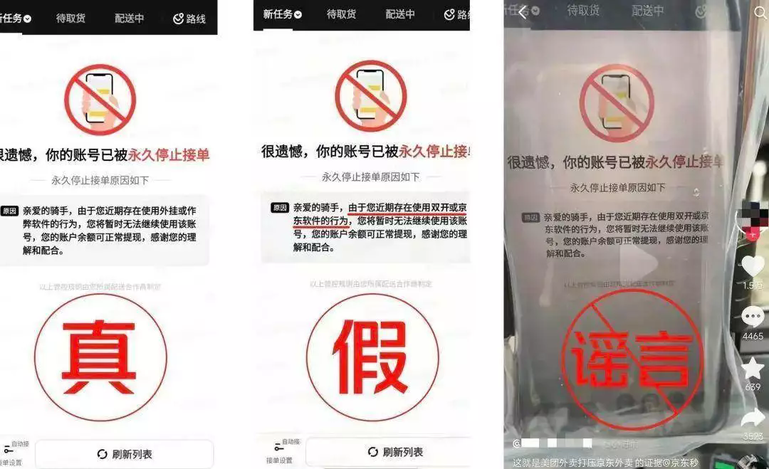 美團4月27日在其官方公眾號“小團有話說”發布聲明稱,在澄清“去其他平臺跑單會被美團永久封號”的謠言后,社交平臺上依舊出現了騎手App顯示“永久停止接單原因為:存在使用雙開或京東軟件的行為”的謠言圖片。