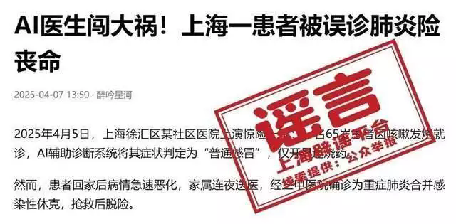 近日 有讀者向上海辟謠平臺詢問 網傳“AI醫生闖大禍! 上海一患者被誤診肺炎險喪命”的消息 是不是真的?關于“上;颊弑籄I誤診喪命獲賠127萬”的消息在社交平臺和部分自媒體上傳播,